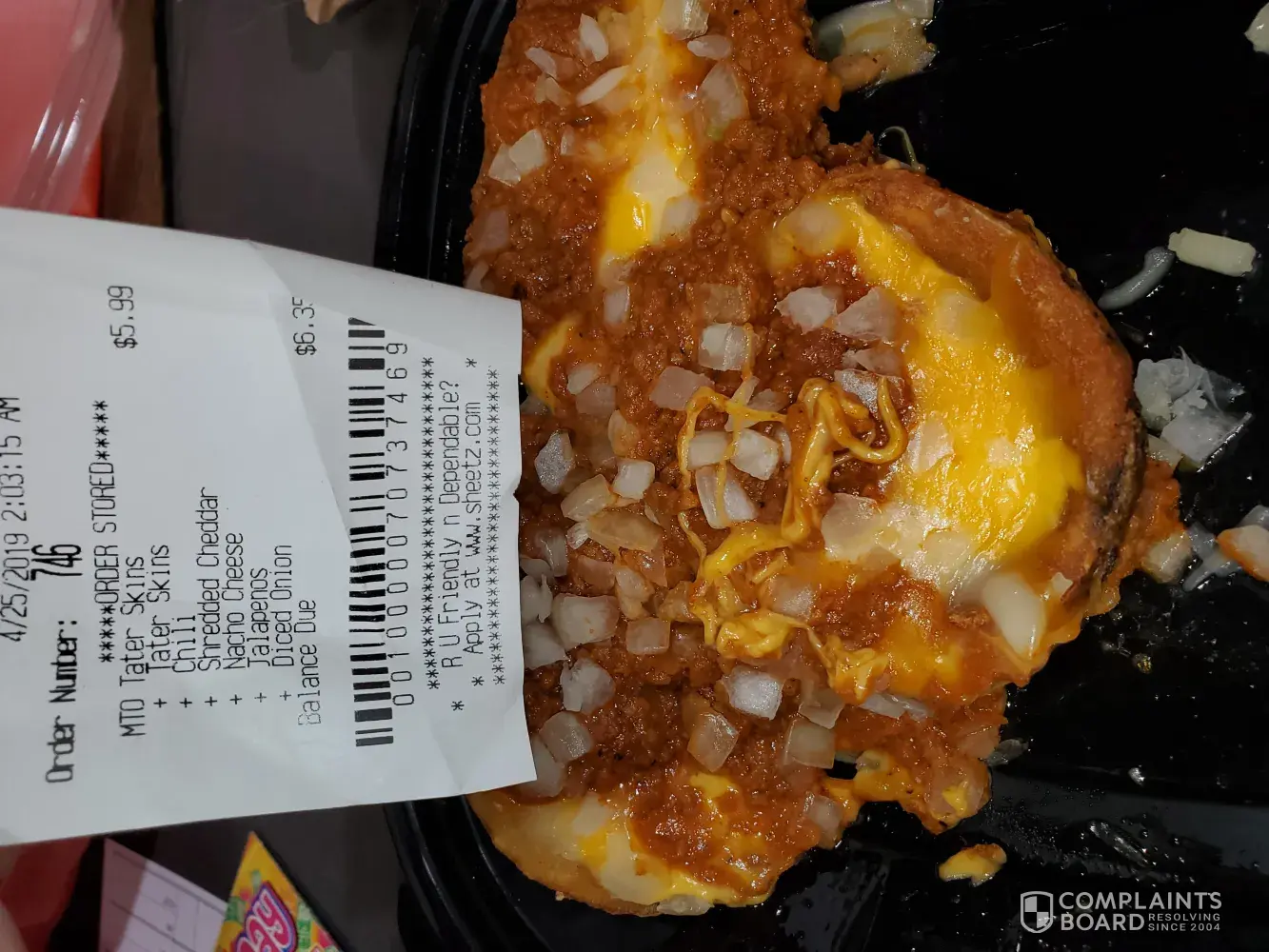 On 4/25/19 I Purchased a sub and tater skins at Sheetz #101. I am generally happy with my purchase here but tonight my steak sub is cold, cheese not even melted. My tater skins are under cooked the cheese not melted the bacon fatty greasy and not cooked and thrown into the container one i'll top of the other . I did not see the option to take photos before I threw the food away and now it is in the trash dumpster so I cannot provide photo evidence of these claims but my amount Was $11.80 plus tax. I would appreciate reimbursement please. And thank you so much.