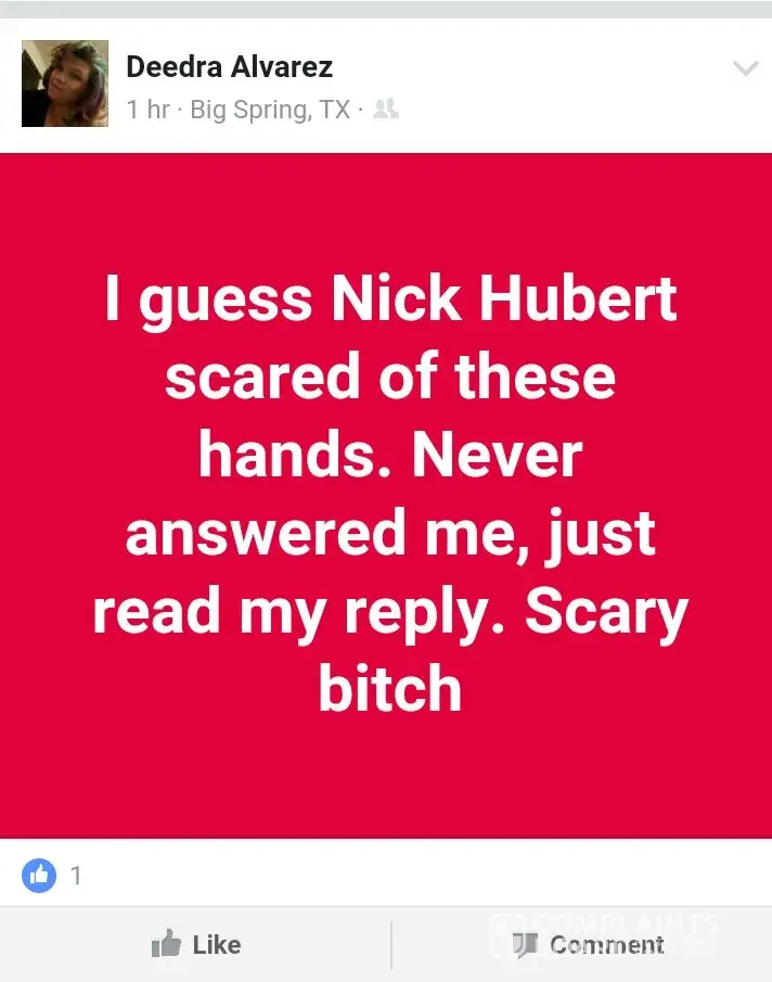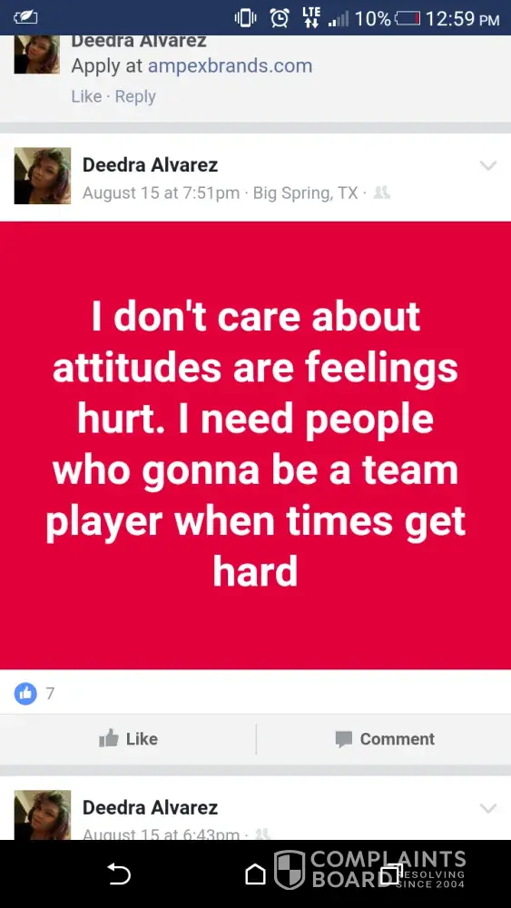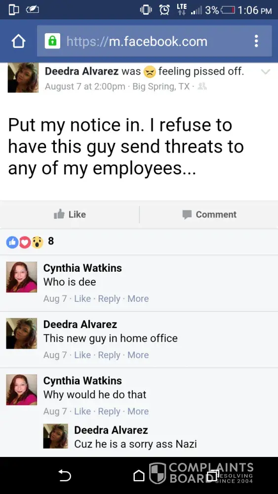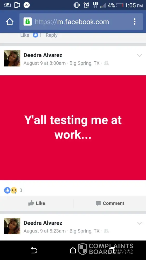 A manager located in Big Spring Tx posts on her facebook about her job and how she goes around the counter "calling people out" ready to fight them, put on blast former employees and talks about higher management and how they threaten her and how she cusses at them, I have gone to that store and she has her son working with her and he's running around, eating and she will get smart and tell you something when you tell her. I have all the screen shots to prove it. How can you have a manager that taunts customers that she don't like come in and taunt her employees? She refuses to submit applications of people she don't like since she can't do the hiring no longer. She's very unprofessional and a bully.