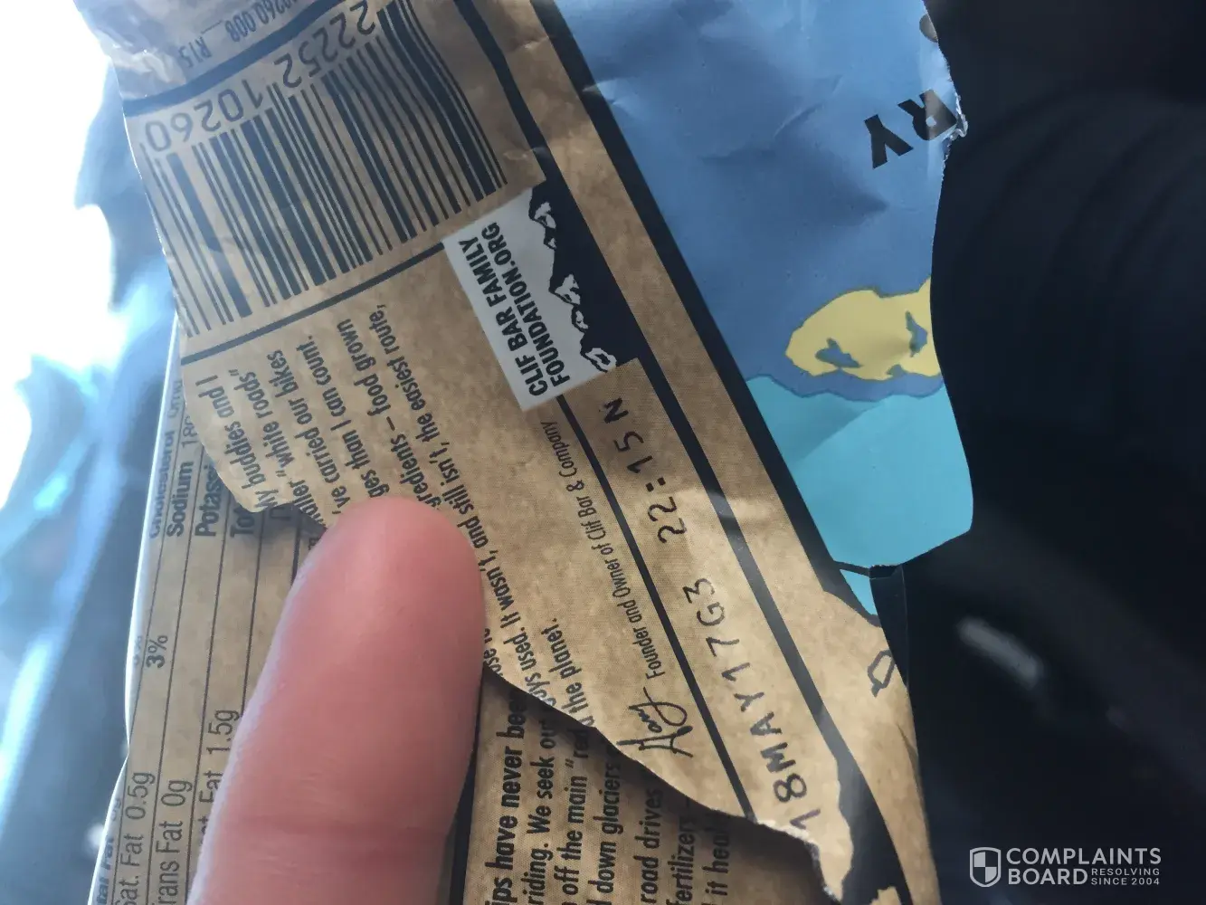 While driving through Indipendance, California, I stopped at the Shell station where I purchased two cliff bars. After driving away I took the first bite of a blueberry crisp bar and immediately thought something was off. After a few more bites I had to put the bar down because the earful taste of rancid nuts was undeniable. It was then that I checked the expiration date. May 18, 2017.