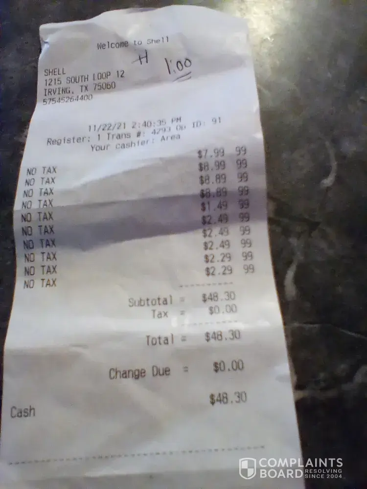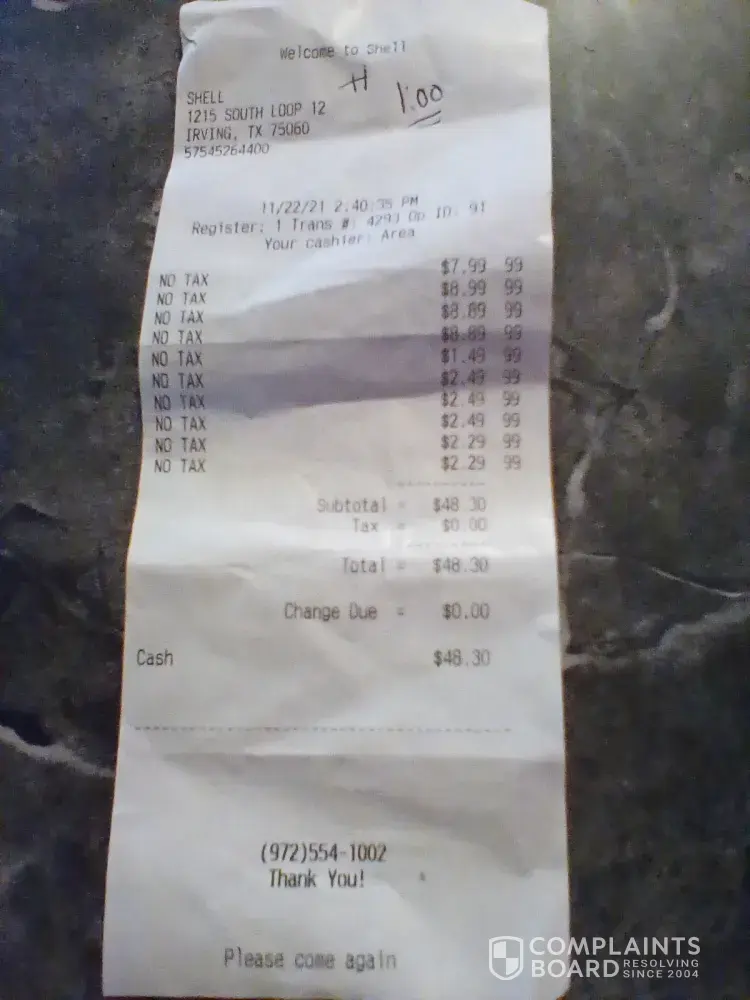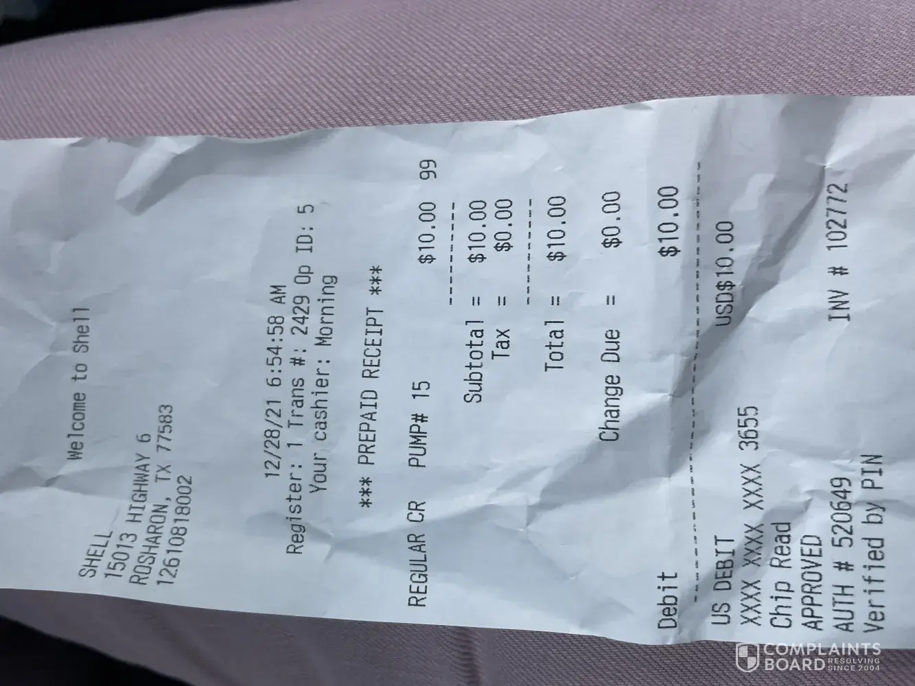I stopped at The Shell station @ 697 Henslee Dr., Dickson TN. (Fast Stop #4) The # on top of receipt is [protected]. Time was 3:56:03 on 8/12/21,