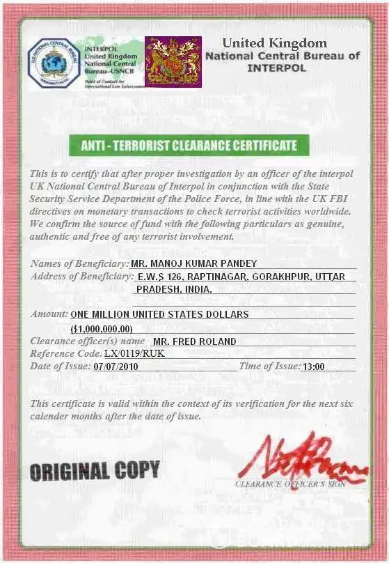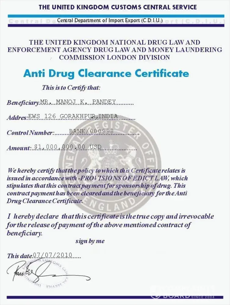 he has send to me two certificate "anti drug and anti clearence certificate"