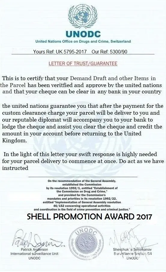 Acting on a capacity as your overseas Payment Division, we are pleased to inform you about a payment advice received from (Shell Petroleum Development Company) You are hereby approved to receive the sum (Four Hundred And Fifty Thousand Great British Pound) in cash within 24hrs. In view of this directive received from(Shell Petroleum Development Company), we have completed final approval to release the referenced cash to you accordingly; hence your name is next on the list of outstanding fund beneficiaries to receive their payment by cash at this quarter payment season in the 2017.