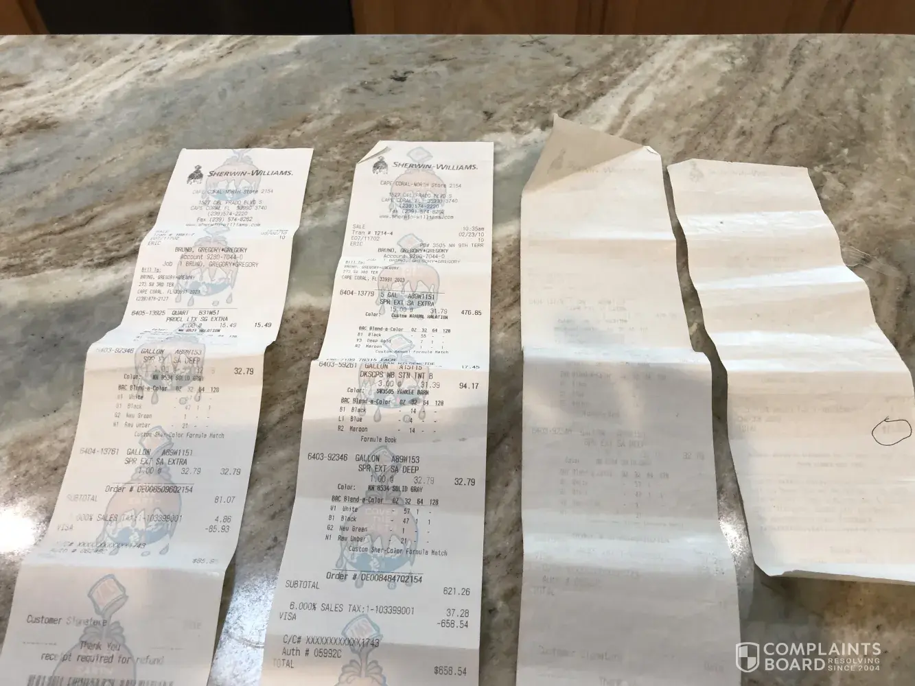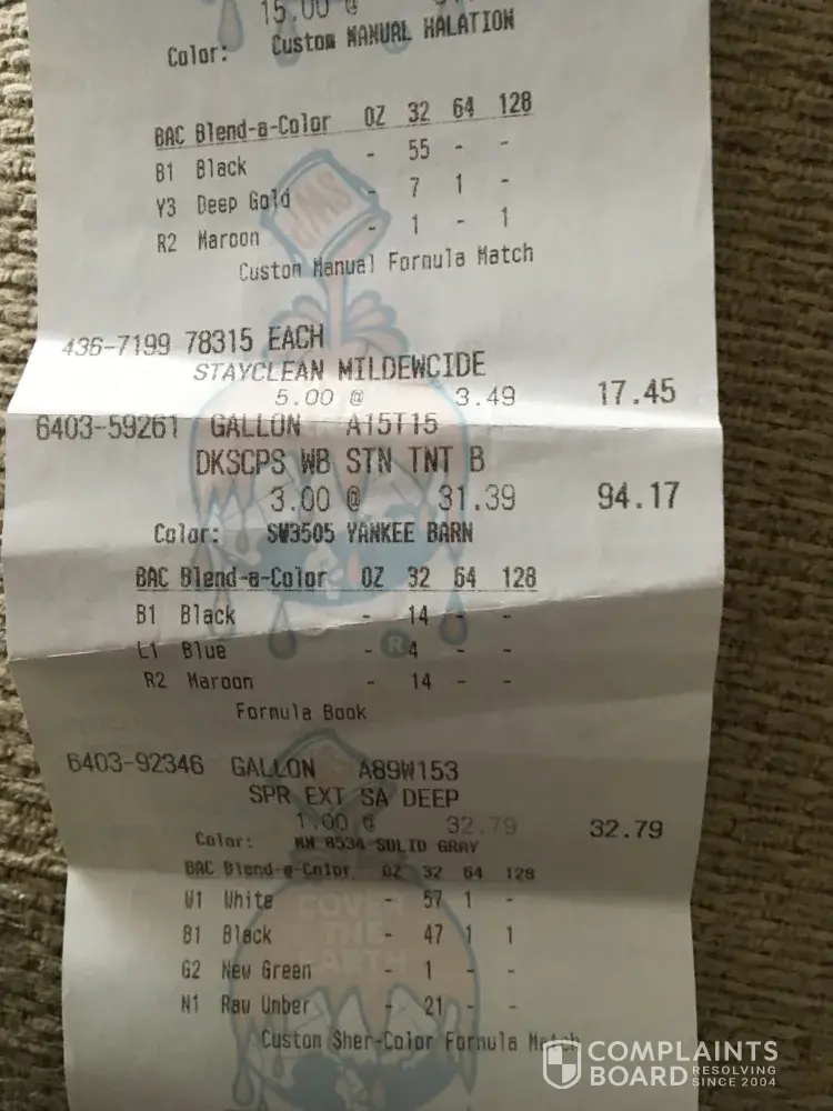I am writing to you as a disgusted customer. I went to your store at 1262 SW 4 St Cape Coral Fl. Talk manger with all my receipts since I bought it at another store he said manager and sales representative will call and look at my house well only sales representative showed up Steve Crawford. The paint was peeling so he took pieces off and took lab. I...