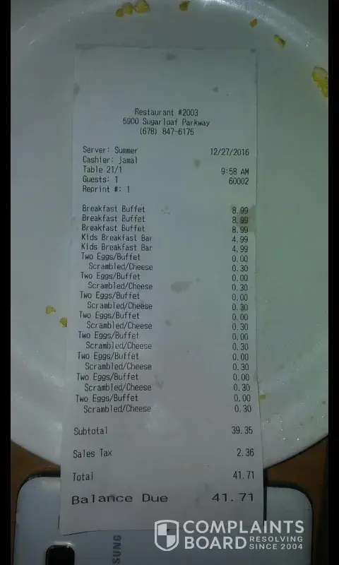 Person restocking the breakfast bar let several bins of food fall into the warmer water. The water went into the food, and the guy put them back on the bar. He then used utensils from the contaminated food in other fresh food he had brought out. Now several things are contaminated. I asked to speak to a manager who took 10 minutes to show up. Then another 15 for the contaminated items to be removed from the bar. They then offered me something from the menu and had the audacity to charge me after I would not eat off the bar. I ordered pancakes which were brought without syrup. I asked three different times for syrup and 25 minutes later I finally get syrup and the pancakes are cold. Not only did they charge me for this food, they charged me for the buffet which DID NOT eat ANYTHING from. I will NEVER eat at ANYTHING Shoneys restaurant again!