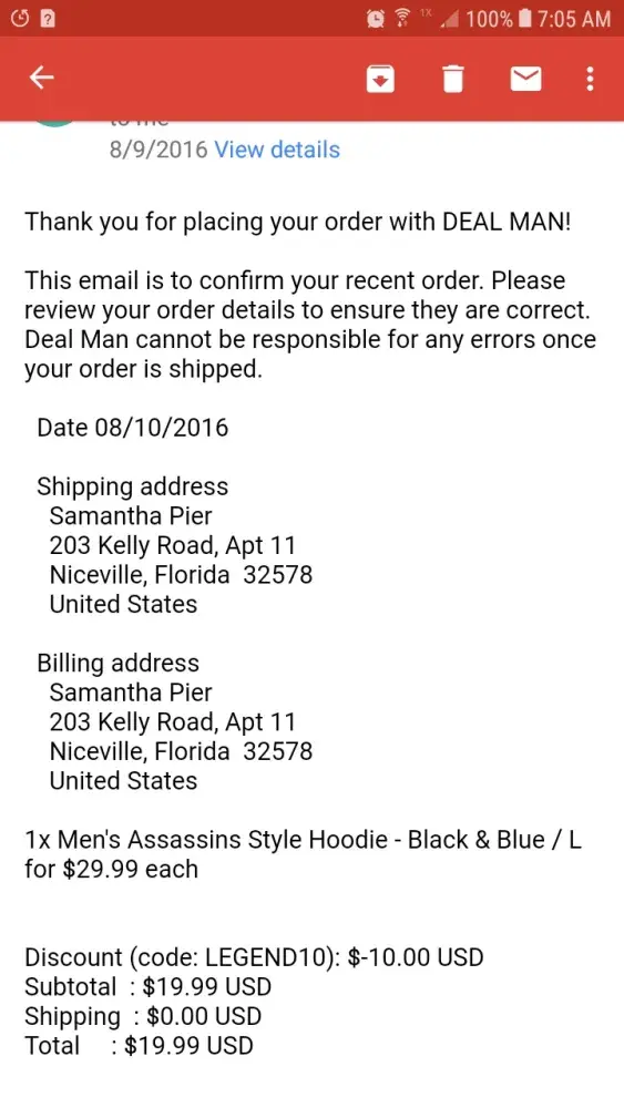 This email is to confirm your recent order. Please review your order details to ensure they are correct. Deal Man cannot be responsible for any errors once your order is shipped.