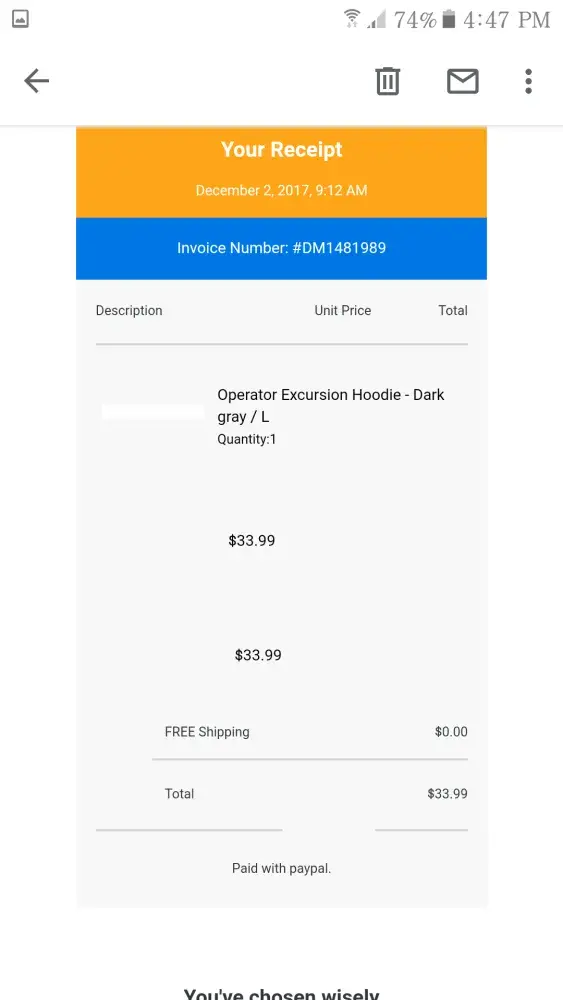 I paid two items (sweater) online via Paypal with the Order Number #DM1419055 since 18/09/2017. But so far (4 years 06 months later), I did not receive the delivery.