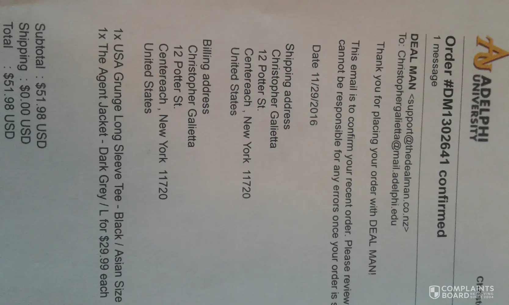 On January 10, 2017 I made a purchase for $59.98 for 2 hoodies. I received an email saying my products had been shipped (Order #DM1316163) with a tracking number that never worked.