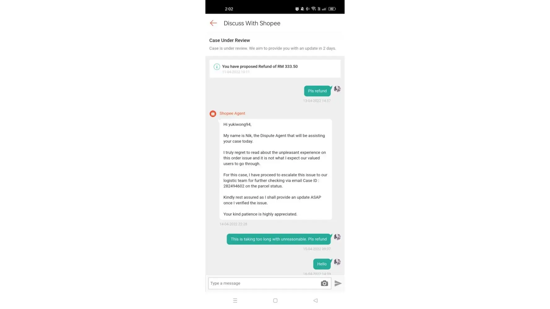 Later, the refund is back to the customer, but I never received any return parcel as your team stated I will received in 3 to 5 days due to high volume of parcels. I wait until the 5 days but the parcel statue has no any changes. So, I ask for assistance again on 24/4/2022. Then what the response I get is "kindly wait for 3 to 5 working days" with no any explanation.