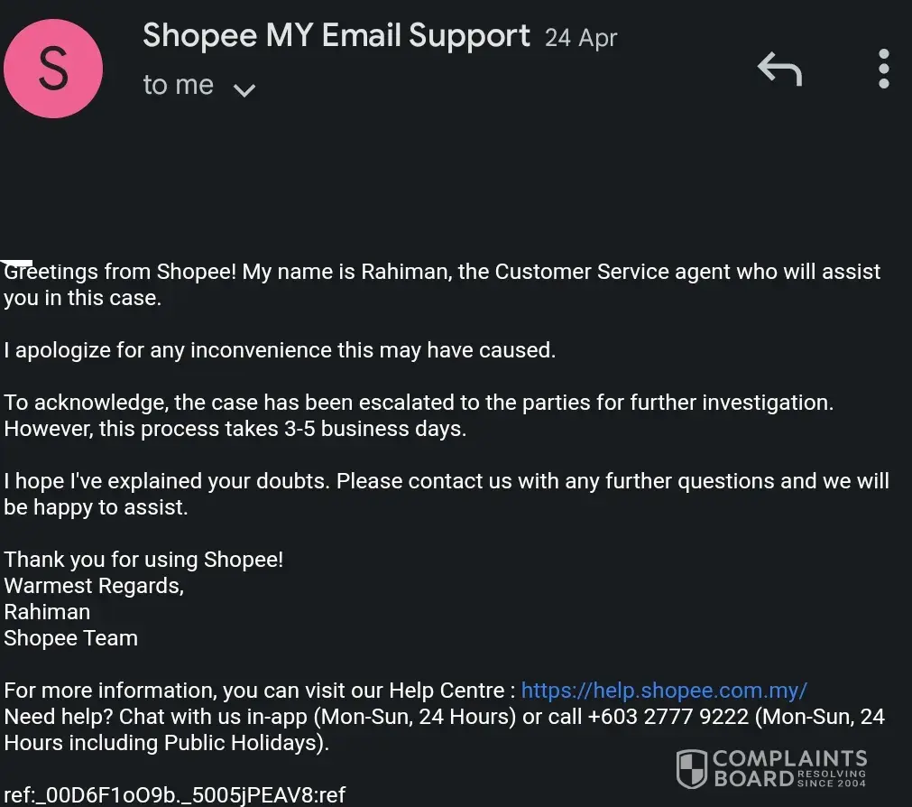I am not the only customer experiencing this shabby treatment by Shopee as I have heard of numerous similar complaints by other Shopee users. Lazada is definitely a far better platform.