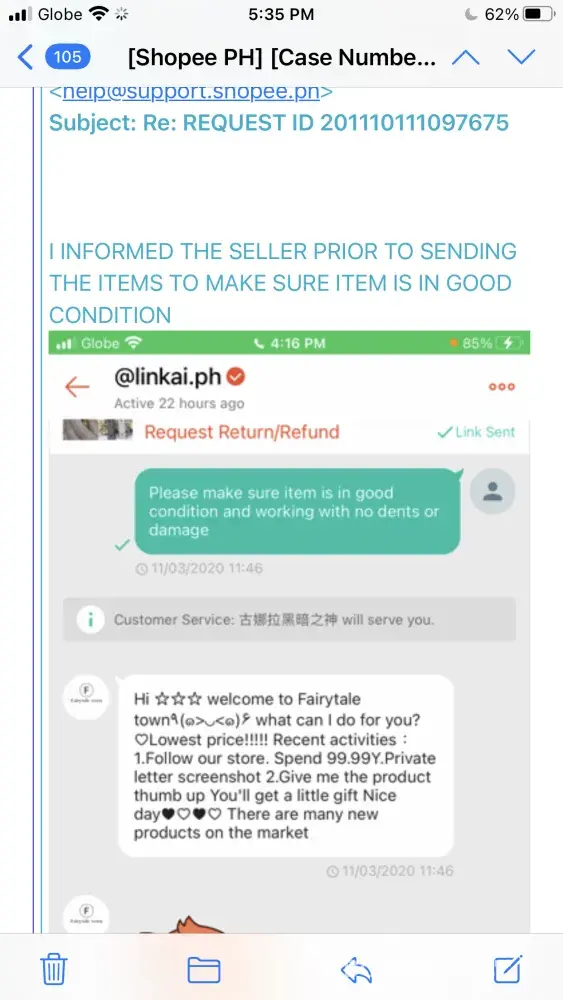 i tried to return the items and i responded within the period given i even went all the effort to inform you (chat email and call) on what happened and i never failed to remind the seller to send the items in good condition and yet you still sided with the seller ?! i sent you proof multiple photos