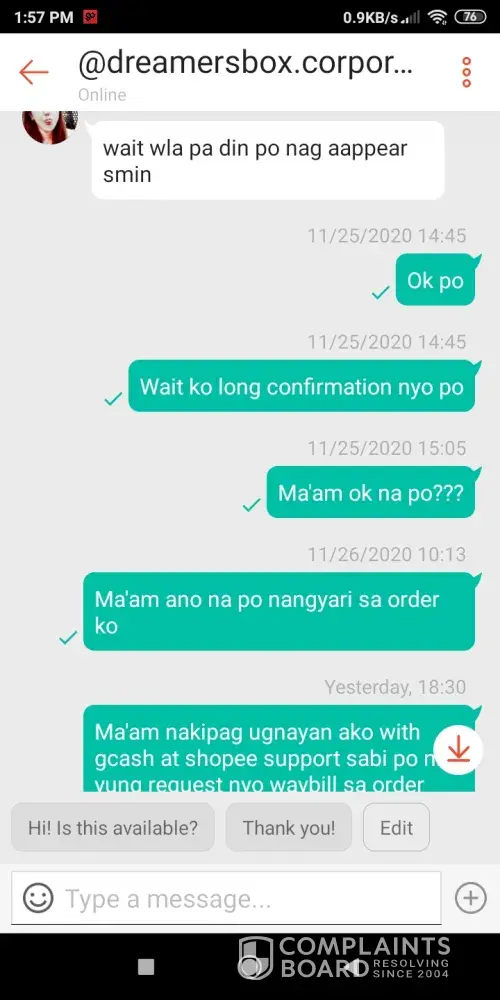 I am writing to file a complaint in line with my escalated case 112712445. My case has been ongoing for almost two weeks now. I still haven't received my parcel that is still in transit since Nov. 24, 2020. No updates from the courier or even an initiative by your company to email me. Your customer support via chat is not helpful. Agents disconecting my chat like Pen, repeating scripts from Karla Paula C, Russell keep on asking my concern and not reading my comms history, Karlo providing false information, your supervisor Remel that is unprofessional for handling cases and all of the other agents I made contact with. I spoke with Jennifer today Dec. 3 that I will receive my order by tomorrow as the deadline given by the said supervisor. She also assures me that I will get a refund if I will not receive it. This is so frustrating as you ruined all my plans just because of your incompetent and useless courier GoGoExpress. I have been a good customer but this is what you can give. I want you to take action for all of this and escalate it to your higher management. Your company doesn't even know how to handle my data under the Data Protection Act. I am expecting to hear something from you.