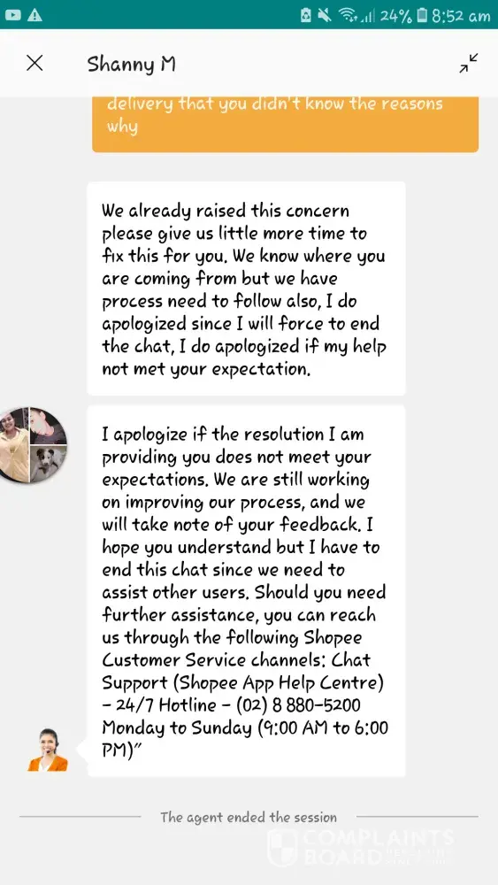 So, I supposed to receive 5 order, however because of an emergency called us no one will be available to receive the parcels before May 08 . Right after I knew that there's a possibility my order will arrive before May08 I reached the sellers letting them know that I won't be available to receive the parcels before May 08 if those will arrive earlier than May 08 . They told me ask the courier cause they already ship out the items and they don't have control with it . Okay, Since couriers haven't pick up the items yet, I contact shopee customer service first . Letting them know about my request to have it deliver before May 08, they said that they don't have control as well to the courier once they pick up the parcels. Okay fine . I contacted the courier every day I even get mad to them because they are unreachable but then one day when the parcels arrived to their warehouse they phoned me !let me know tht they can't hold the items until May 08 because they will have penalty they can only hold for 2 days I guess . So we agreed to have it reorder instead . As well as the seller ! Now the removed my COD option and they can't lift is right away . I'm pregnant and it's frustrating that I can't check out my baby essentials ! The supervisor that I spoke left the chat wihout informing me and resolving my issue ! I need to have it investigated !