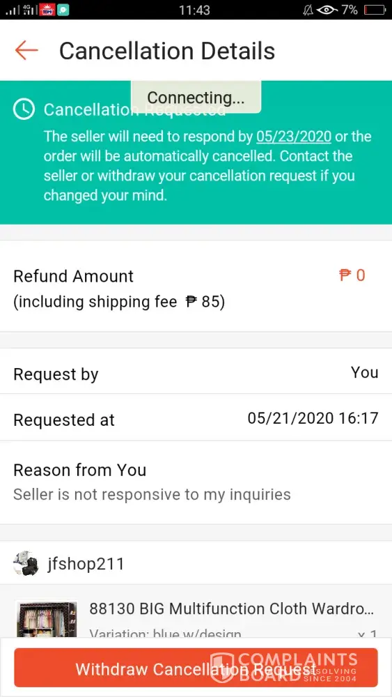 I ordered the item last May 20, 2020 7pm, and tried to ask some questions to the seller, but no response. So I decided to cancel it, May 21, 2020, 4pm. The message appear that the seller need to respond on it by May 23, 2020 or the order will automatically cancelled. But at May 23, there's still no response, nothing happened. No automatic cancellation happened. I tried to contact the seller again, but no response, I just keep to my mind that maybe the seller is busy, so I decided for another one day, May 24, but my item are still on cancellation process.