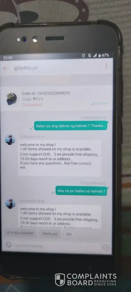Seller noticed that the item is already completed but i do not received any helmet. Seller also indicated that they are not supporting COD but payment thru bayad center, banks, 7-eleven, etc. I paid at 7-eleven expecting for the helmet to be processed but until now i do not receive any updates. I hope it will get corresponding action. Im very disappointed shoppee because it was my first time to order in your online shop but it end up with this scam. Im just asking for the refund of my payment.
