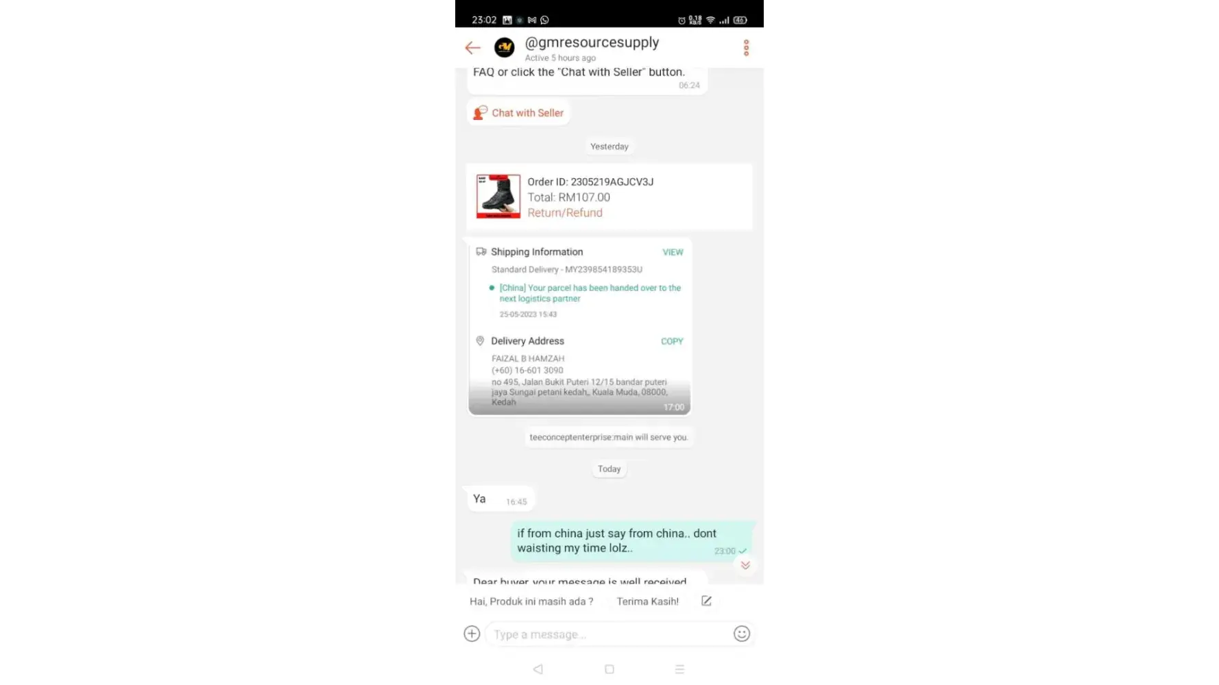 I have bought shoes from a seller in Melaka.. the delivery period is 7 days and until now there has been no movement of the items that were posted.. I have asked for the money to be returned but it was refused and the seller has sent a message on shopee showing the postal slip of the goods from China.. I feel deceived and urgently want to use the goods