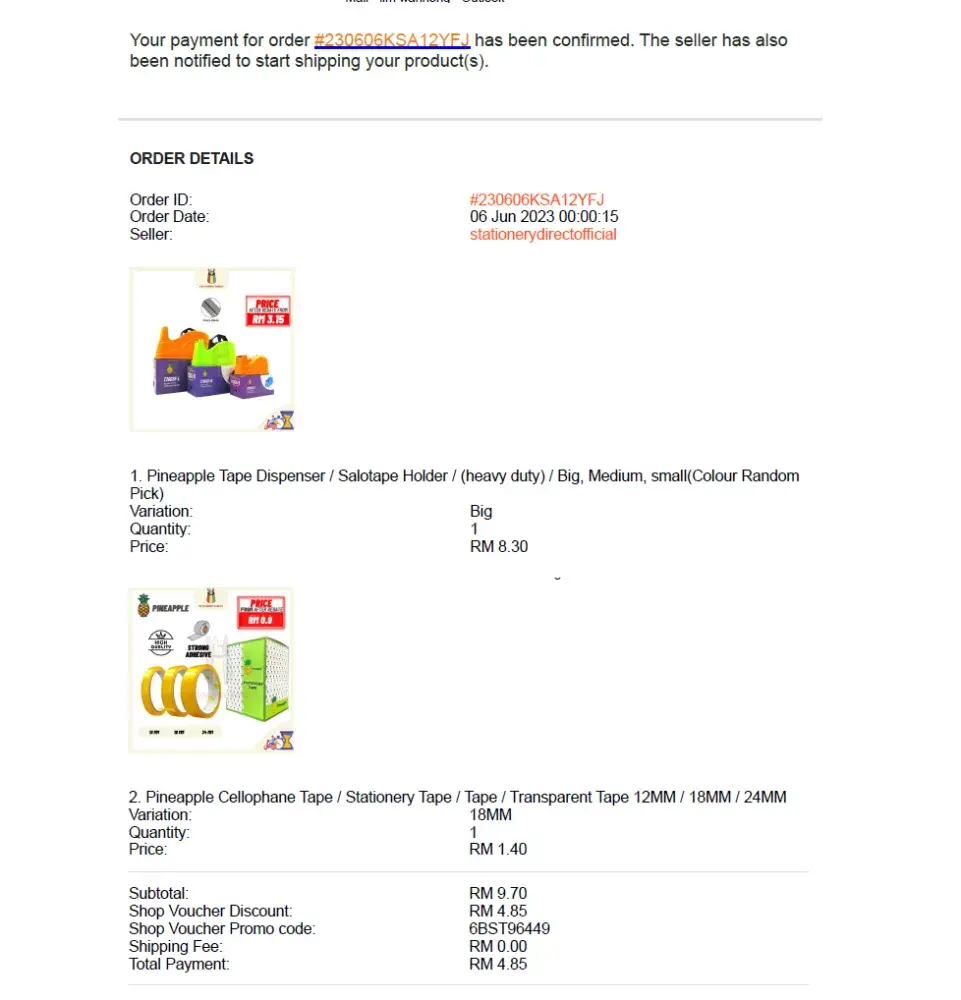The last order was on 6.6 sales, a tape dispenser and a tape that I used a rm5 cash voucher from the seller and rm6 free shipping voucher with no min spending. So I only paid about rm5 for two items. It was really a good deal.