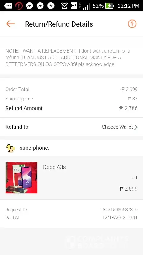 I file a return/ refund request for a phone oppo a3s but they never replied on my request! They wanted me to return back the item but they never provide complete information how the process works, then I found out that there is a refund of my money cod but I really dont know how to get it! Ive been trying to contact the seller but they are not answering my questions!