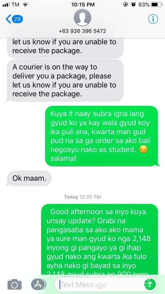2, 148 ang gi pangayo sa courier ninjavan og nag give ko exact amoung gi ihap gyud nako ang kwarta ika tulo ayha nako gi bayad sa iya 2, 148 gyud supposedly 1, 248 so mao tu subra og 900 pero gi suklian ko niya og 300 naningala ko but gipa dayon lang nako unsay nahitabo gi dawat nako ang sulki pero naa pa gyapon 600, dapat 1, 248 ra gi bali man niya og ingon dapat 1, 2 dili 2, 1. I called him 2 times and he told me that pangitaan ra niya og paagi mo balik ra daw siya if subra kay makita daw ang total sa ilang system but wala siya ni balik and worst is that he block my number.