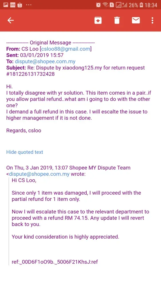 I am very annoyed by the way your customer service agent hadling my return request. I bought a pair of solar gate lights from Shopee Malaysia. One of the light was damaged when it was delivered. So i initiated a return request. To my surprised, the CS agent only allowed one of the damaged light to be refunded. What am i going to do with the other one? I strongly disagree with it but he still proceed with the refund without my consent. This is absurd.