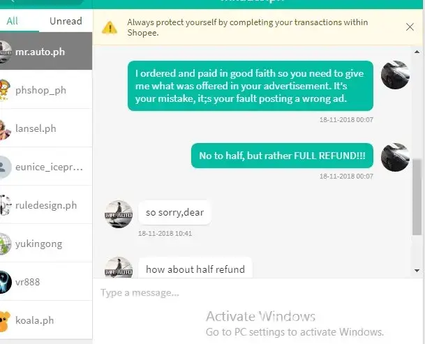 November 17, the seller submit a dispute and admitted in chat that it's a wrong advertisement, that there's a mistake. Then he asked me for a half refund. I told him that I need a full refund since it's not my fault posting a wrong ad.