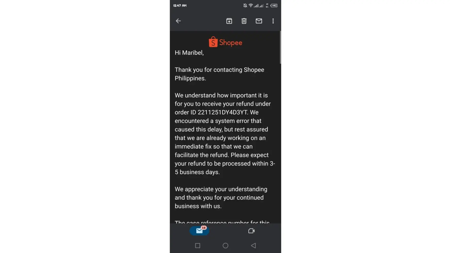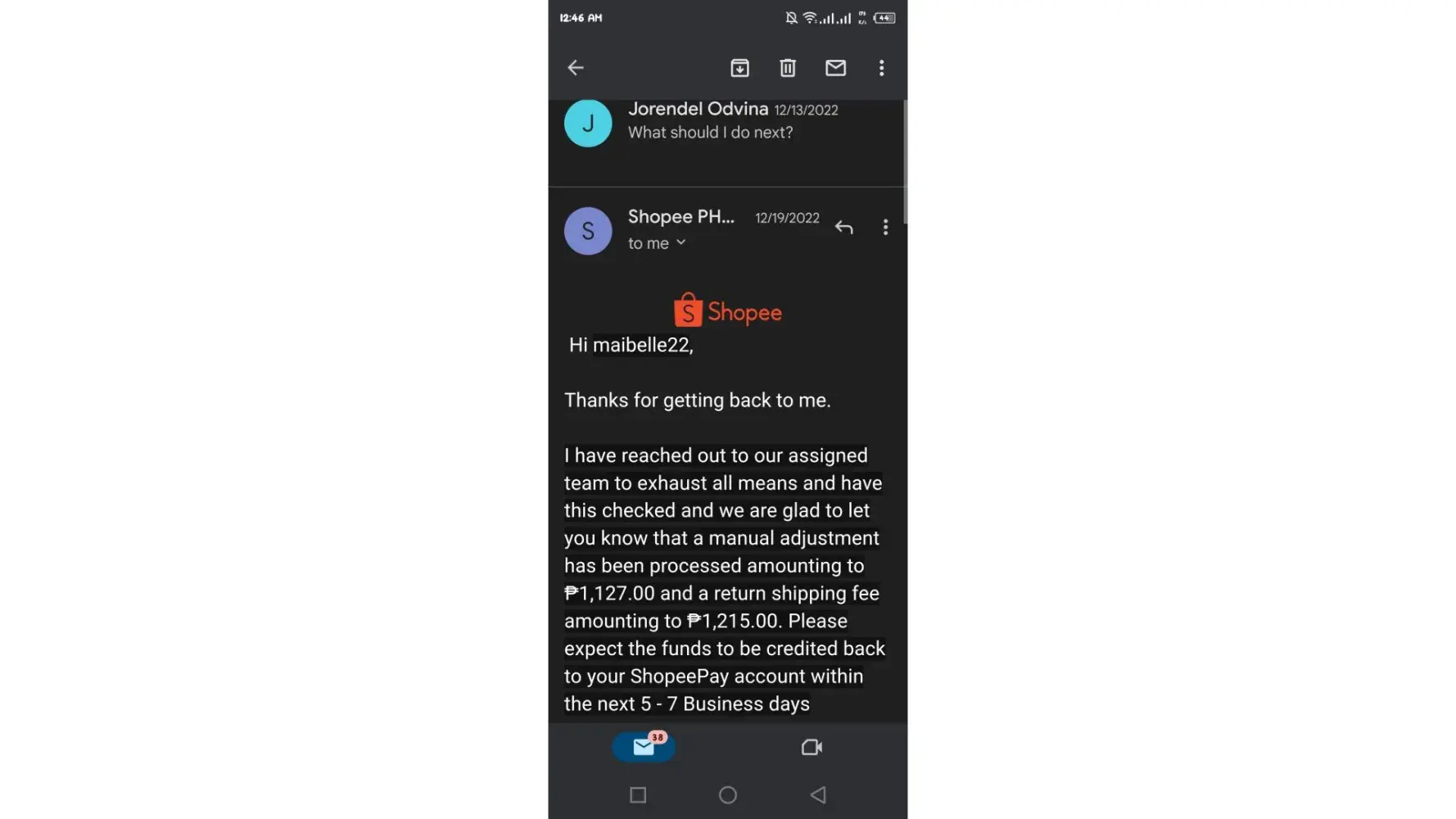 Shopee didn't give my refund. I have ordered a defective product and it was delivered on January 10, 2022. It was just last month. So I file a refund and they approved it, because the item was proven to be defective. So, Shopee Dispute made me send back the item to the seller and told me to even pay for the shipping fee. They said that after the item got received by the seller, they will send my refund to my Shopee pay and even pay for the shipping fee on my behalf. The time that I was arranging the shipping of the item they were so cooperative, but after the item was successfully sent back to the seller I got no more response from them. I tried to send them emails regarding my case, but I got no response from them. It's been 13days but I can't still get my refund back. ðŸ˜