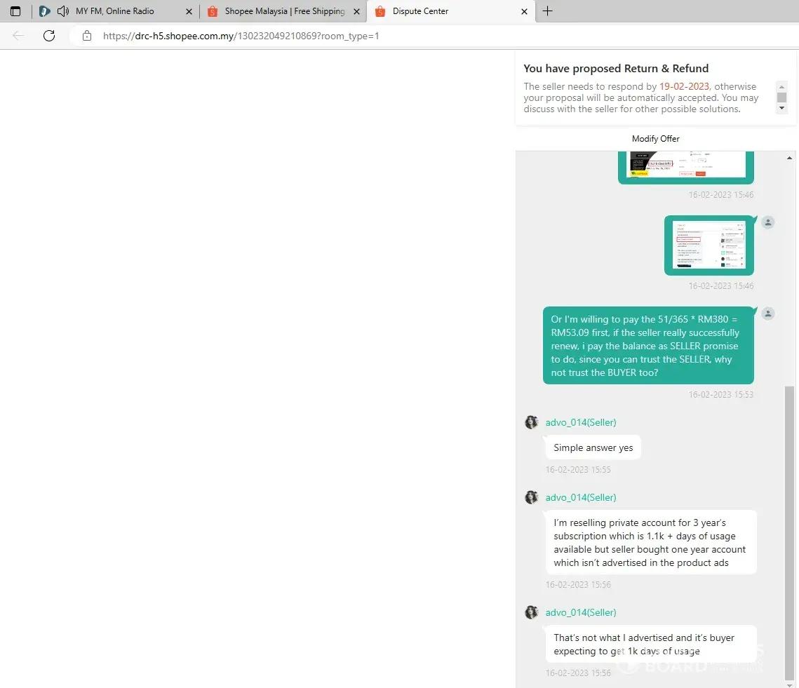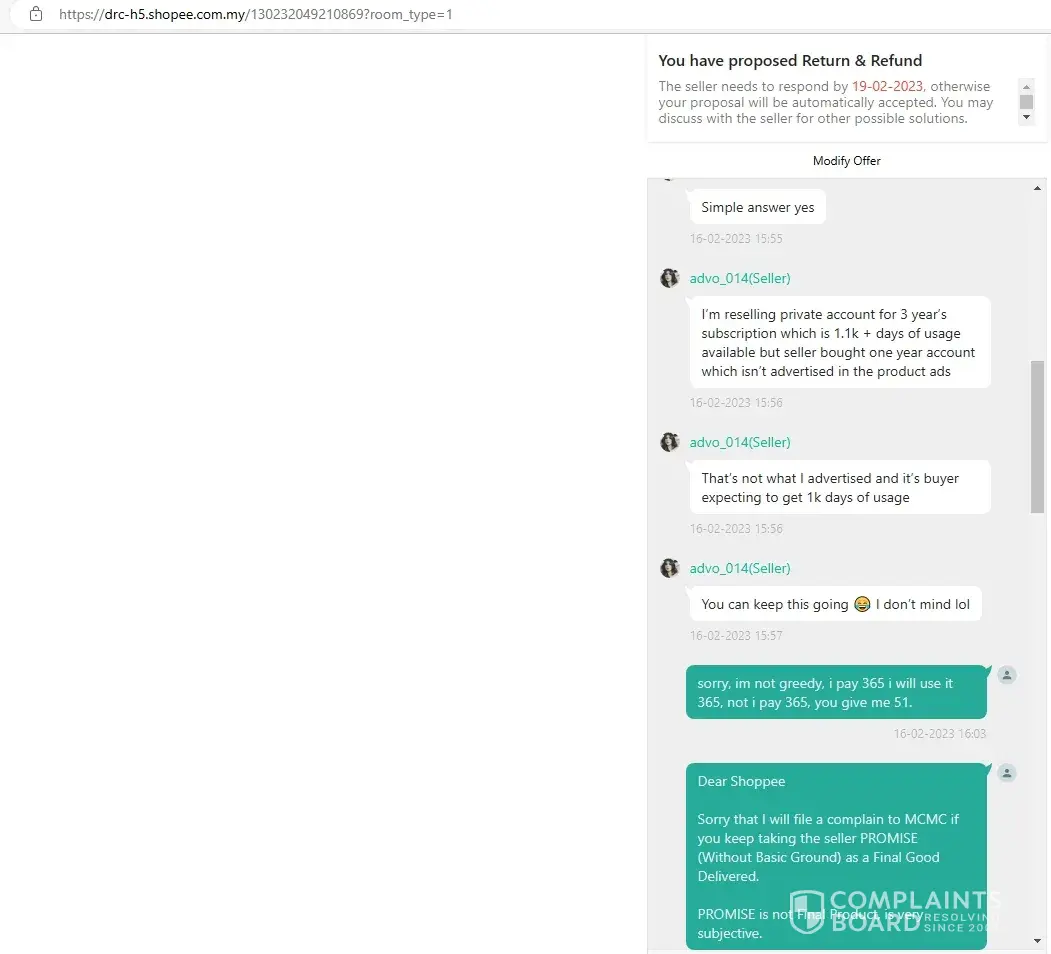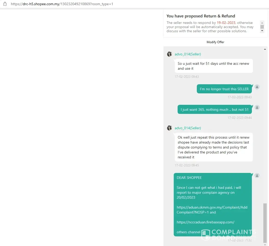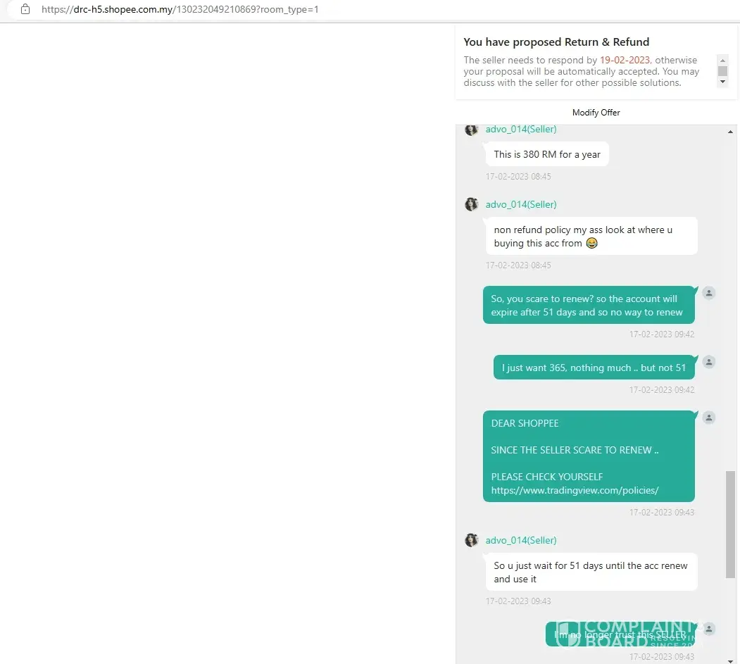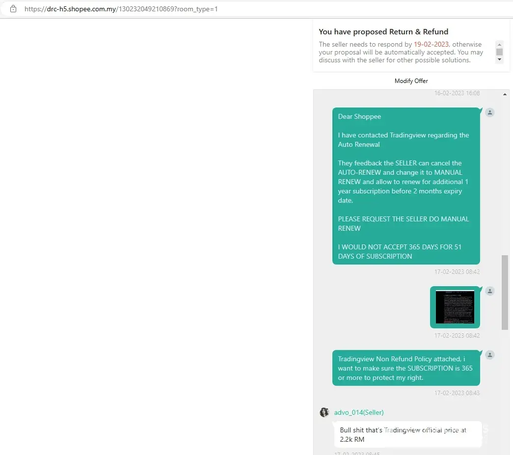 I bought a 365 days subscription service, once received the login id and password, the subscription left 51days, i have requested to cancel this deal because the service incomplete, but Shopee denied refunding and allowed the seller to renew the subscription when due after 51 days, it is ridiculous when the seller can refuse to renew, no body knows what will happen after 51 days later.