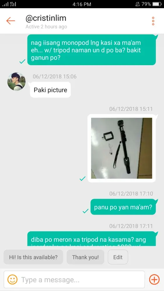 nag order po ako ng yunteng 1288 monopod w/ tripod w/shutter, dumating yong order ko monopod lng w/ shutter, walang tripod, hinanap ko ngayon, nag chat ako ky cristinlim na seller, sabi pic ko daw po, send ko sa kanya, sabi nkalimutan daw ng tao niya, mag place order daw po ako ulit, umorder ulit ako, sabi ko isama nlang yong tripod, ok daw, ngayon dumating na ung order ko, wala pa din yong tripod, sabi niya iba daw yong nka assign na tao. Kami po yong nag usap eh. gusto ko lang naman makuha ko kung anu yong binayaran ko.