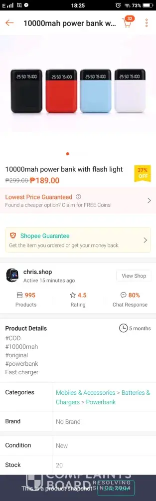 Hi good eve I would like to raise my concern regarding with the powerbank I bought via cod. Because its indicated in the details that it is original and fast charging. I bought it because it was in the flash deals from 299 down to 189. When the item arrived last saturday first I charged it before I used. Found out that the powerbank is not original