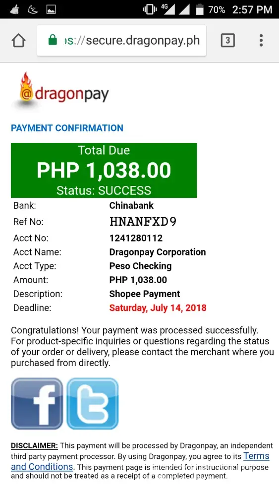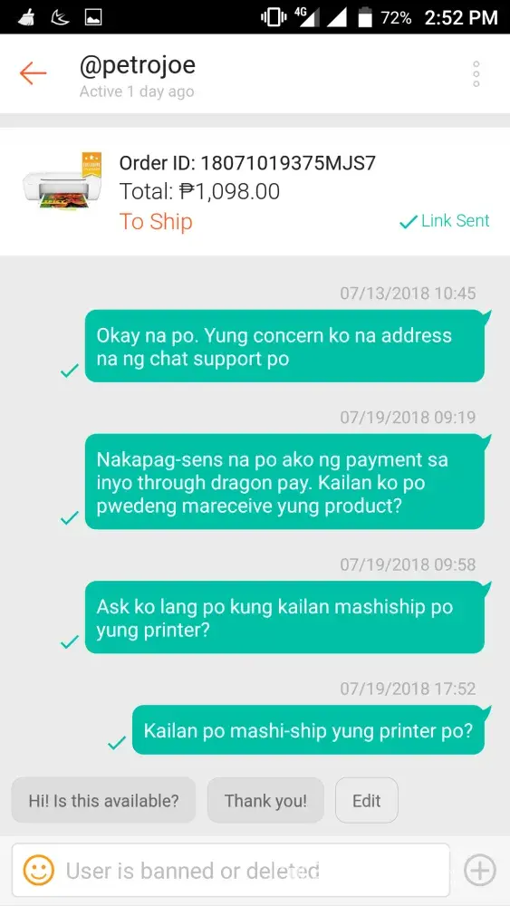 Last July 10, 2018, i purchased a printer online from the username Petrojoe and then I paid it last July 13, 2018, over the counter of Chinabank.