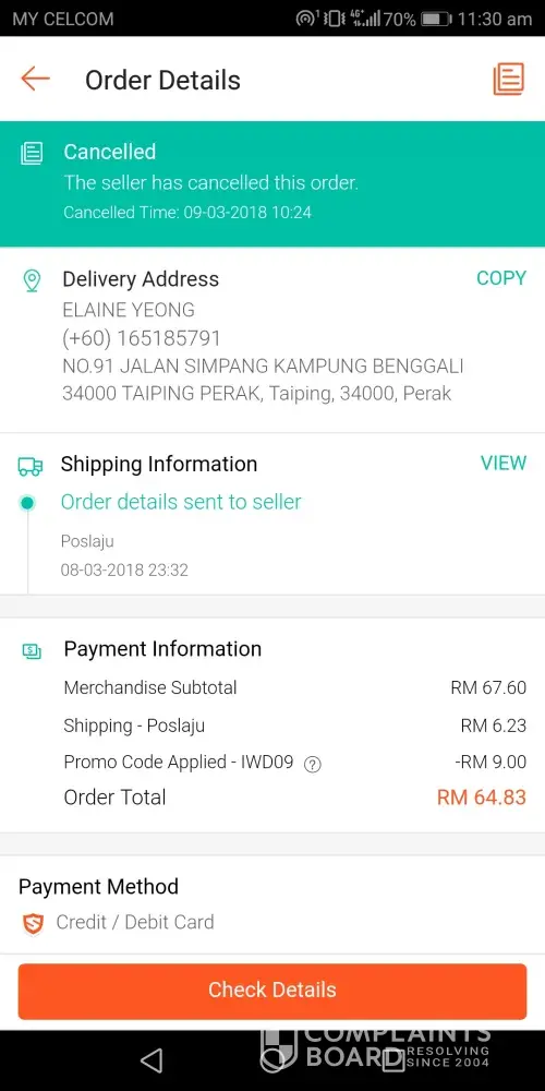 Read full complaint and 38 commentsmy order was cancelled even if I already paid for it