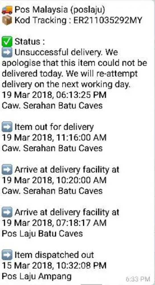 my order was to be delivered door to door... the LBC texted me with the tracking number ref#[protected] in the morning of march 19, 2018... so i expected it will be delivered to me in my home address which is Lower Zone 8, Bulua Cagayan de Oro City. in the afternoon of March 19, 2018 i recieved 4 misscalls coming from [protected] and. txt informing me...