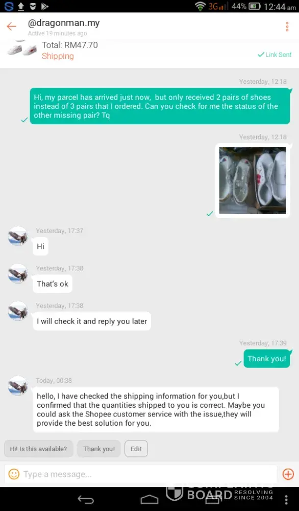 Hi Shopee, I've ordered 3 pairs of shoes from dragonman.my on 12/04/2018, and received the parcel by today 27/04/2018. The matter is, I only received 2 pairs instead of 3. I'd already asked the seller due to this issue, as he replied they sent me the correct quantities as ordered, but I didn't receive the other pair, the seller ask me to contact Shopee customer service for solution. Where did the missing item go? The parcel was completely seal with tape. Can you help me alocate where is my other shoes? Is it being send separately? The payment will be release to the seller soon, but I did not receive enough item in my hands. Kindly help me with this issue, hope to hear a good news from you. Tq