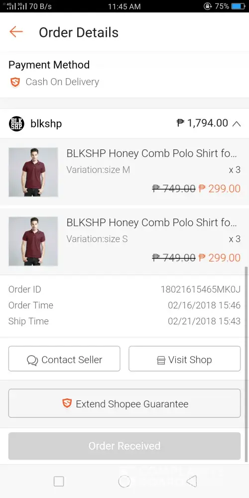 Last feb. 16, 2018 I ordered 6 blkshp honeycomb polo shirt (maroon) 3 small and 3 medium from seller blkshp. The package arrived feb. 22 and paid the amt of p1794 but when I opened it there were only 2 polo shirt, 1 small and 1 medium. I chatted the seller and they assured me that they will deliver the other 4 polo shirt. The seller called me (feb. 23) and said that they will deliver it themselves by monday morning (feb. 26). And now (feb. 26) still no items received, so I chatted the seller, he said that because of the holiday (edsa revolution), they wont be able to send the items and need 1 more day. (why they didn't inform me much earlier about that cause of delay? So that I know, that im not worrying that I might got scammed?) but today is the last day of my extended shopee guarantee. If they still wont be able to deliver the missing items tomorrow (feb. 27), I would like to refund my payment.