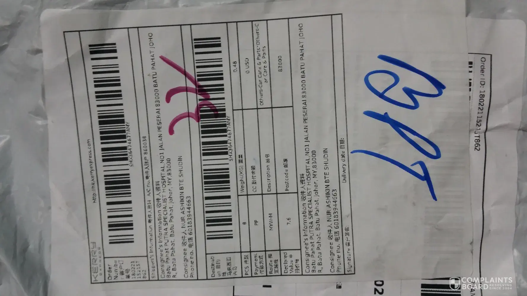 Order ID: 18020121076C7TD