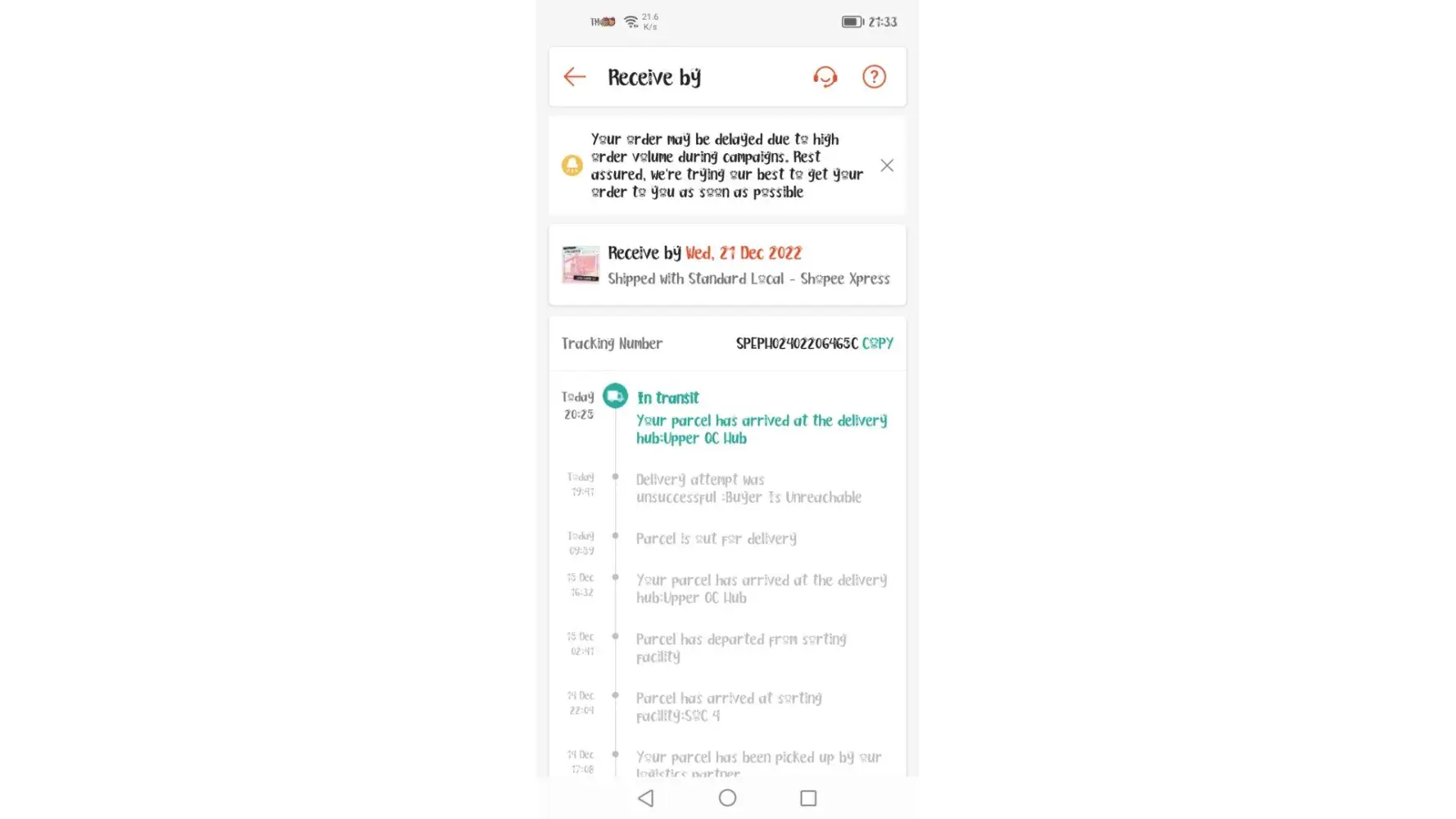 It is showing the status of my order is delivery attempt was unsuccessful buyer is unreachable but I havent receive any call and text from the shopee express logistics. Please follow up my order tracking # SPEPH02402206465C and the order ID is 221212E333ST59. I pay it through spay later so I hope that I can receive it