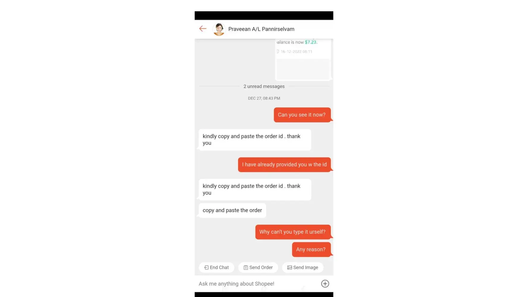 After I have told him that my product has been delisted and therefore I can't provide the link to my product. I send him a screenshot of my previous order. Instead, he ask me to type out the order id. You can refer to the attached screenshot. Let me know if he has an attitude problem.