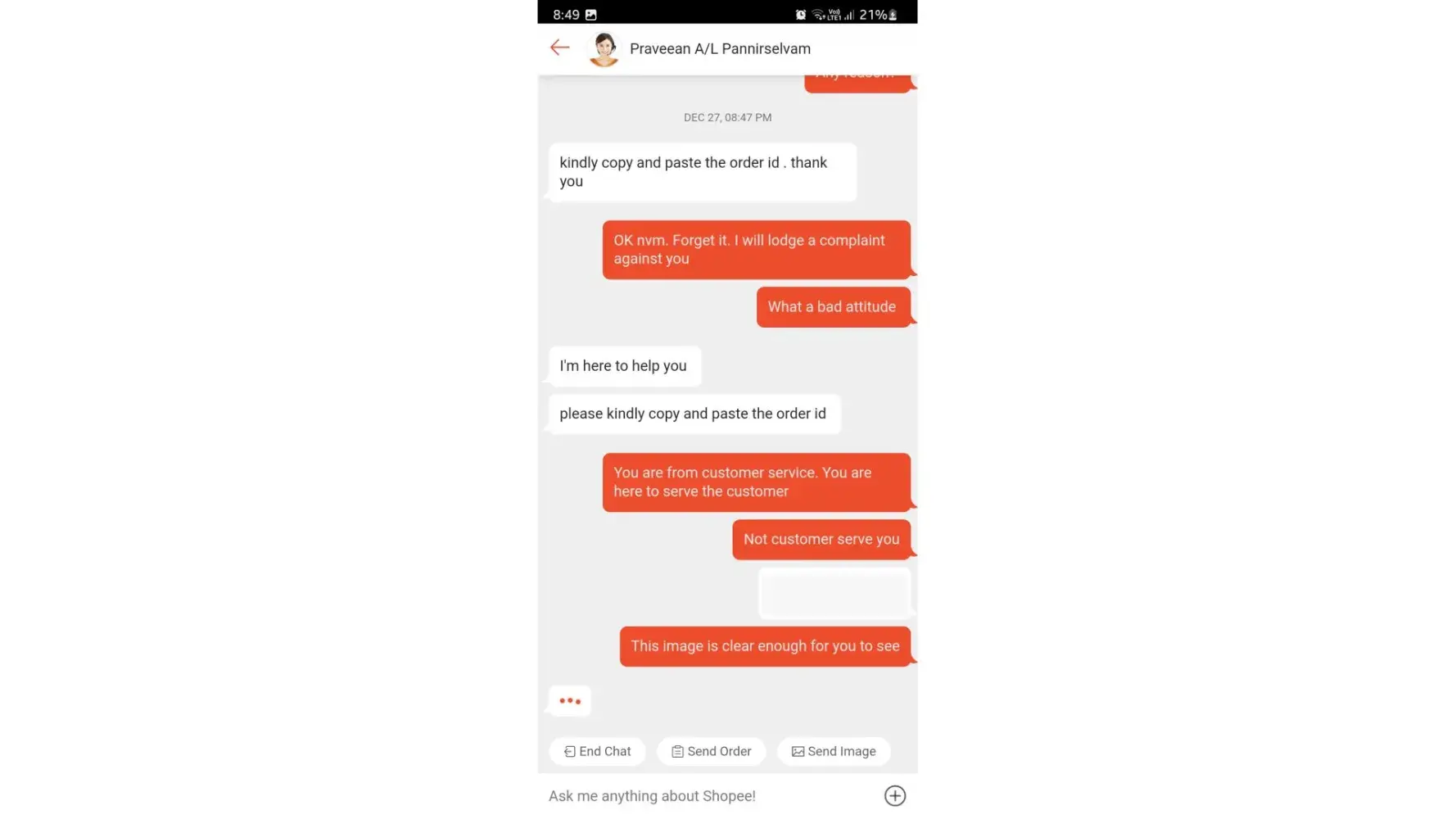 On Tuesday, 27dec22 at around 8pm+ I was supposed to chat with a shopee agent to resolve my item delisted issue but instead of having my issue resolved, I encounter a bad attitude customer service officer by the name of Praveean A/L Pannirselvam.
