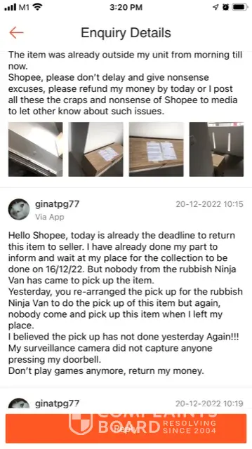 I contacted Shopee and have also mentioned that this is a big size item, a TV console. CS assisted to arrange the rubbish Ninja Van (a logistic company) to pick up on 16 Dec 2022, but again no show and no call after waiting from noon to 10:00 P.M. (I have to apply urgent leave to wait for the pick up)