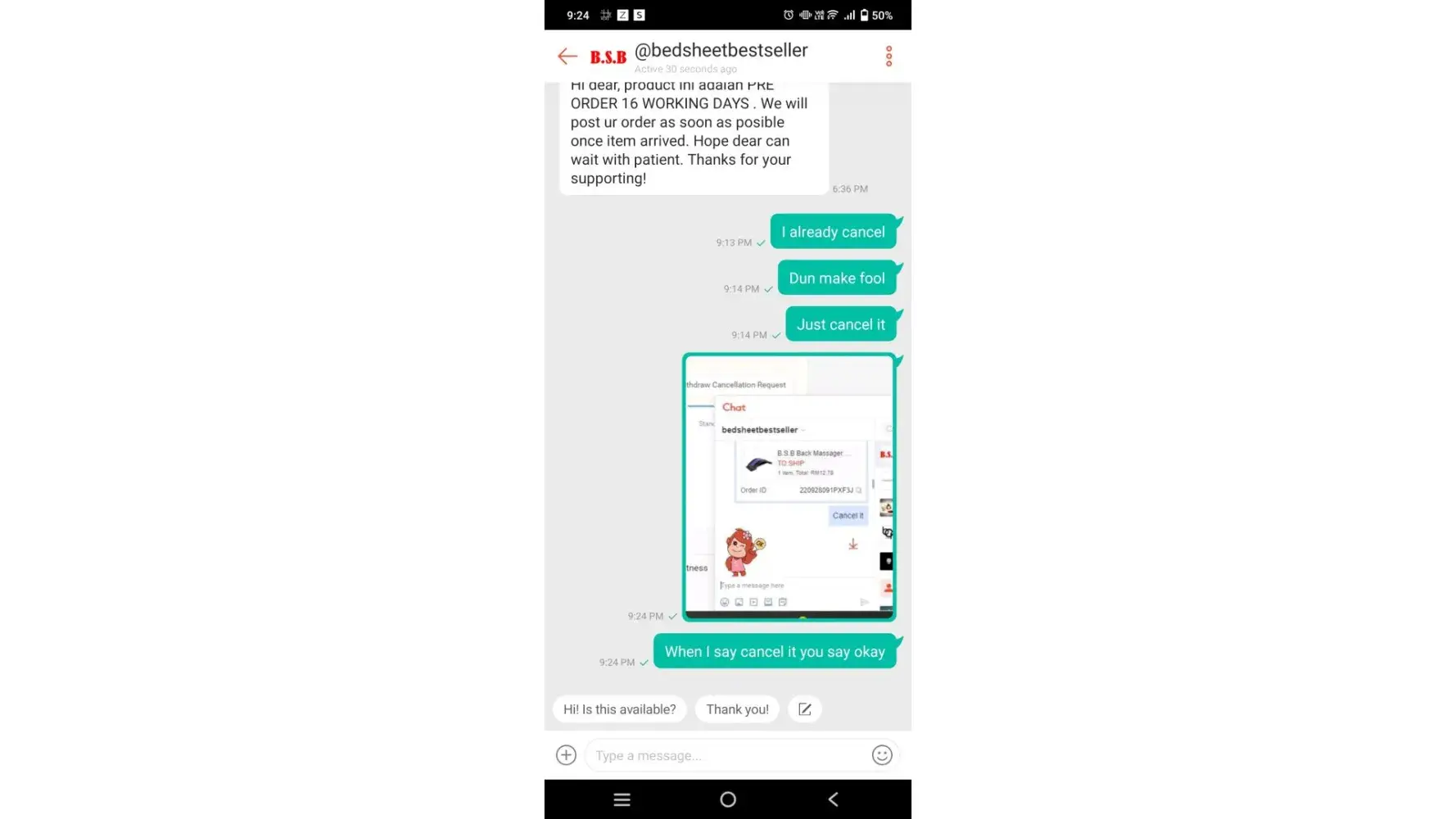 im already do 1 time cancellation because i check the seller got stock that i wanted to buy so withdrawn my cancellation by another day, after that item already out of stock again and i cannot do second time cancellation due shopee policy, so i ask seller manually cancel it but seller tell me as his company policy they cant cancel it without buyer request,ok fine i ask customer service help me do that. So live agent told me he cannot do that also because seller have not been prepare the item, im so confuse seller not prepare the item is it can do cancel or seller prepare to ship that they can do cancel?