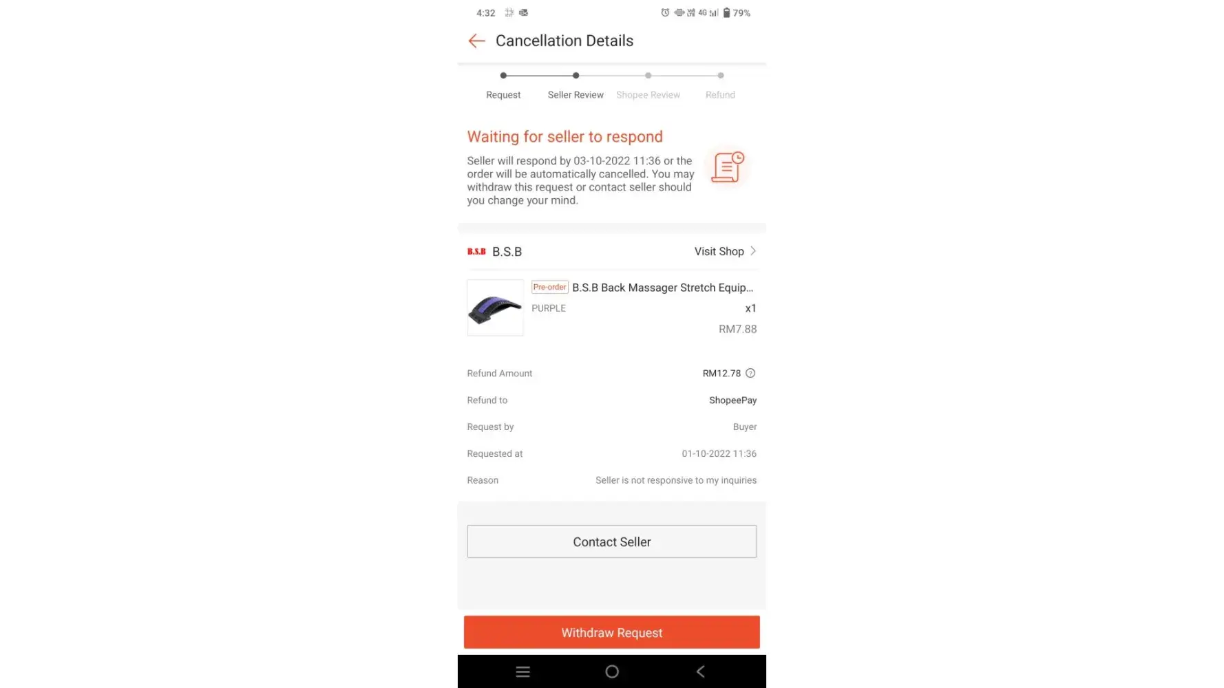Unable to contact seller. 4 days later, Shopee email me that my R/R is approved
