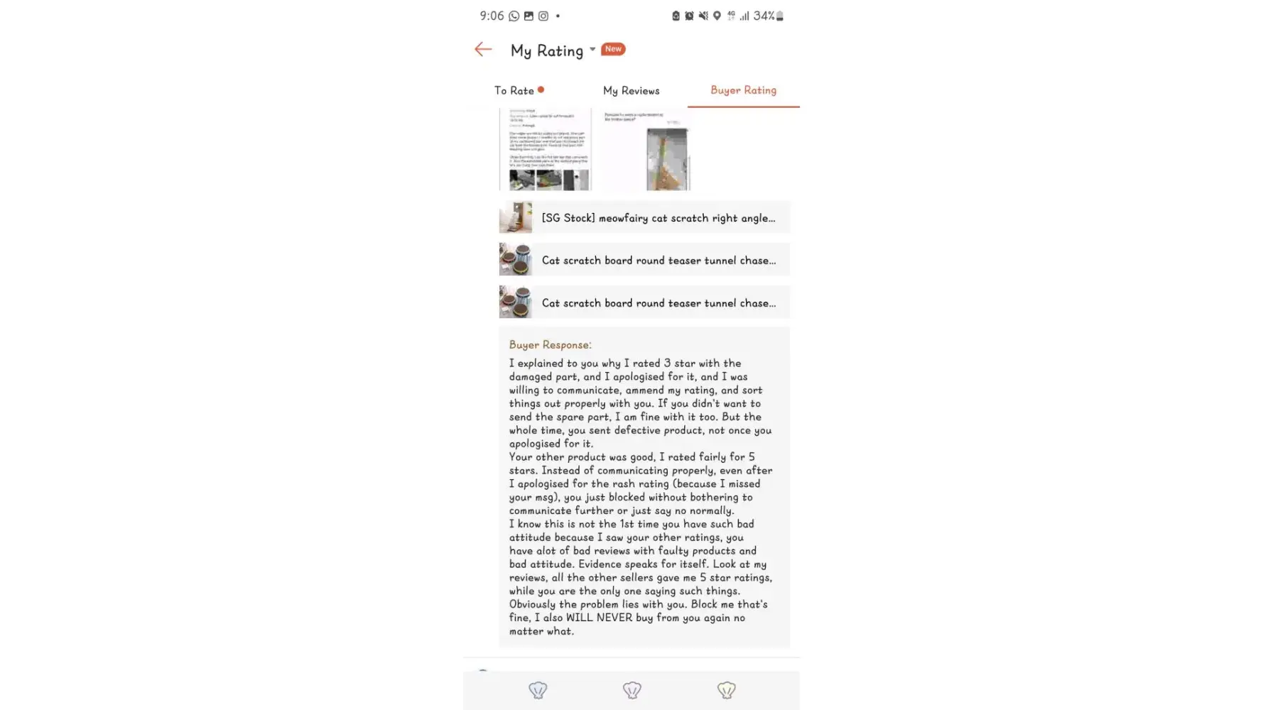 Seller sent defective product with broken parts. I messaged for replacement, but was still very upset by the defective product, and because most of the time on shopee, sellers usually ignore when there's something wrong with the product, so in my jaded-ness, I just gave the rating 1st. I admit that this part I was being rash, but I was understandably upset as defective products shouldn't even be happening, and the broken part has a sharp edge which could potentially injure my cats.