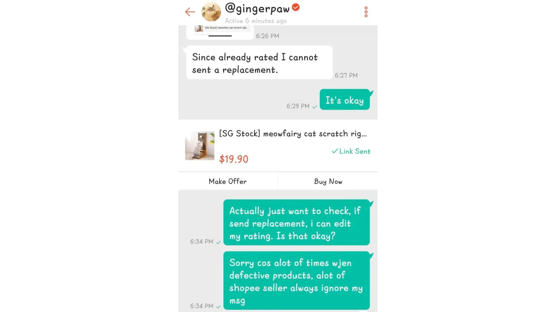Then I happened to see the chat that the seller replied. I then apologised about the rating and told seller how appreciative I was for him/her getting back, and that I didn't see his/her reply before rating.