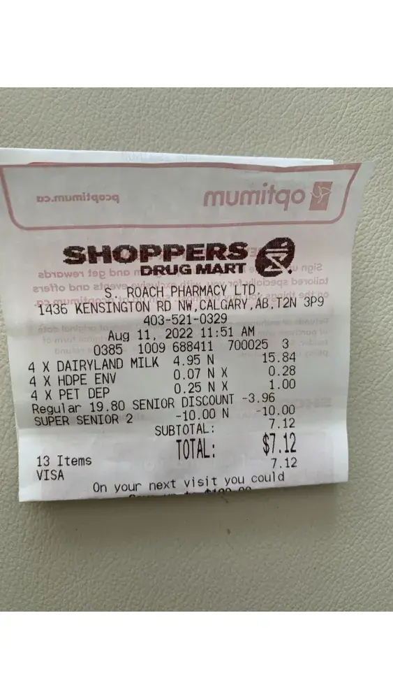 I bought 2% milk from shoppers Drug Mart located at 2525 36th St Ne Calgary today . They refused to give me senior discount. I talked to store managers she said that the milk was on sale and no senior discount on sale items. I understand no discount on sale items. But everything other stores 2% milk regular price is $4.95. This store put the price at $4.94 and told me it’s on sale and didn’t offer discounts. Is that reasonable they are doing business like this . Also I think all shoppers stores in Calgary should be the same price of same products. Why this store is so special? They can reduce 1 penny to take off my 20% senior discount. Hope some one can give me an explanation.