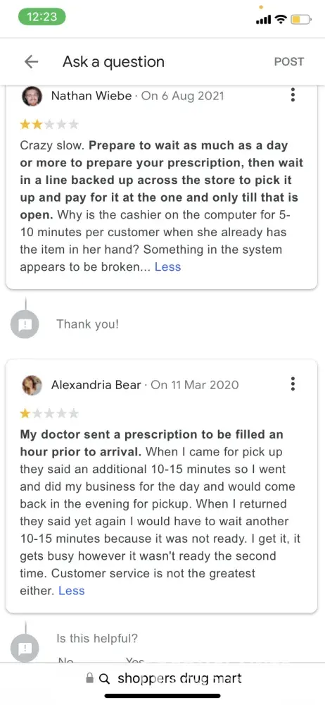 Have called the store about 6 times after they told me to come back the next day when I went in with my month old baby to get his prescription after my doctor sent it in hours before arrival and now I've called 4 days on a row since I hauled him last time in the cold and the whole store doesn't pick up I'm very mad this has happened before when I was pregnant wasn't as big of a deal but the complaints and bad reviews on this shoppers is very high on the exact same reasons so I think there should be a change I'd like to speak to someone higher up