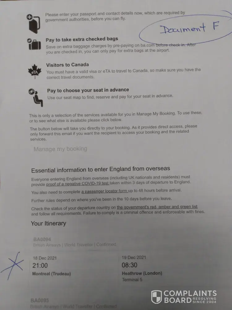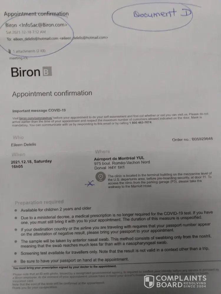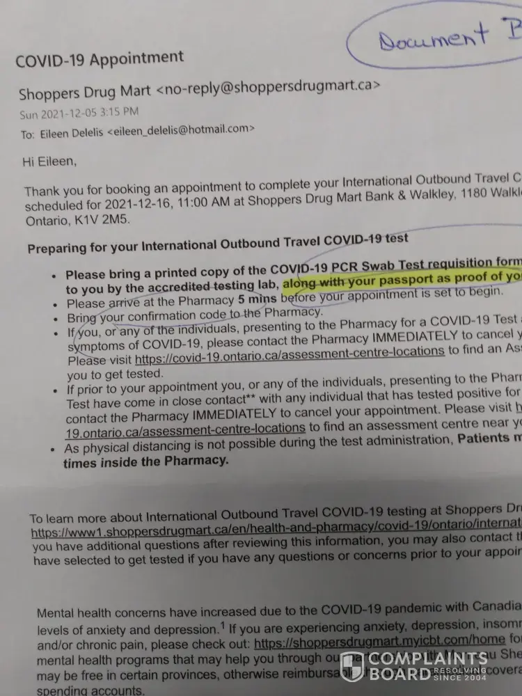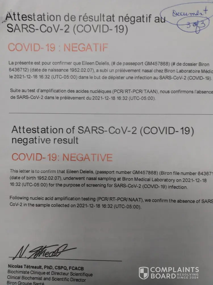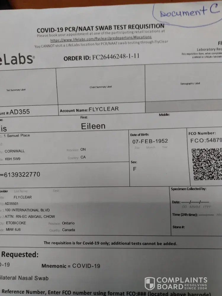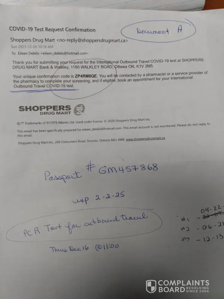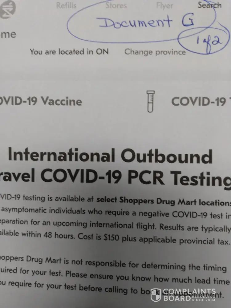 Dec 05/21 -booked appointment for outbound covid test for Dec 16/[protected]@11:00 am (Document B) -paid 150.00 plus taxes - received Swab Test Req (Document C) - my outbound flight was Dec 18/21 @ 21:00 (Document F) - by noon on Dec 18/21 I still had never received an email with my test results - I had to book another appointment for an outbound covid test at the airport (Document E) -paid 299.00 Cdn. - I want a full refund for 299.00 for the second test, because I did not get the service I paid for, the first time.