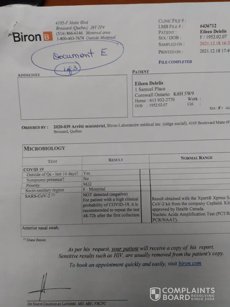 Read full complaintNever received email with test results