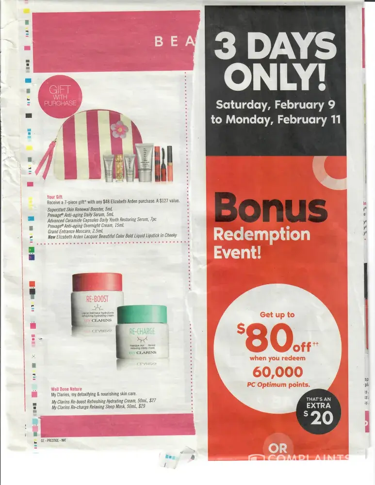 Sunday February 10th I made a specific trip to Market Mall Shoppers Drug Mart to purchase some Elizabeth Arden Lipsticks to get the gift with Purchase adverstised in the flyer. Shoppers did not receive the Gifts with Purchase yet. This was advertised and illustrated in the flyer. They put me on a phone list and would call me to pickup when they come in. This is false advertising with an inconvenience of having to come back to pick up something that was in stock. Then I went to pay for a bunch of other items along with the lipstick, I had shopped because it was Bonus Redemption. I wanted to use 60, 000 of my PC Points to get $80 off. My Points were scanned and the till said that I can only get points not redeem points. The clerk tried a 2nd time, with the same comment. I asked her to try another till, and the same thing came up. I asked her to speak to someone who will be able to process the transaction and she said that customer service was closed on Sunday. There was no way that I could make the ±$100 purchase redeeming my points of $80 without paying the full amount. She offered to put the stuff away until Monday and come back when Customer Service is open. This is simply unacceptable in both instances. Huge advertising radio and print to bring people into the store, and nothing to back it up with. All of us know that time is money and coming back the next day is a huge inconvenience and coming back a 2nd time to pick up the Gift with Purchase is even a larger inconvenience. As well a number of the items I wanted to purchase were 2 day sale items and were no longer at the sale price if I was to came back on Monday. As a long term Beauty Boutique Customer for all of my cosmetics over 15 Years to say I was very dissappointed is an understatement. I look forward to a review and return explanation on the incidents. Thank you, Nives Fatovic
