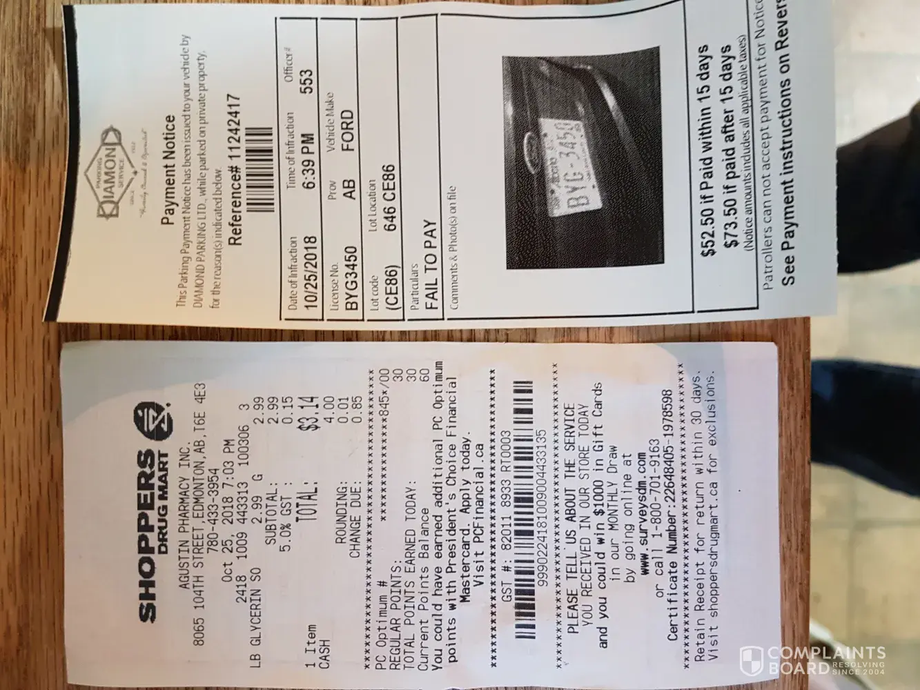 The location address is 8065 104St. This location is supposed to have free parking for Shoppers customers. Recently a new Nova Cannabis opened. I visited last night and could not find a spot near the doors. I forgot that the back half of the lot is Pay Parking. There was nowhere near enough customers in the store to warrant that many vehicles. The line around Nova Cannabis suggests where all the spots have gone. I suggest you're PR and theirs get together as I will stop shopping there altogether if I have to shell out $14 for parking or in this case a $52.50 ticket on top of whatever I am purchasing.