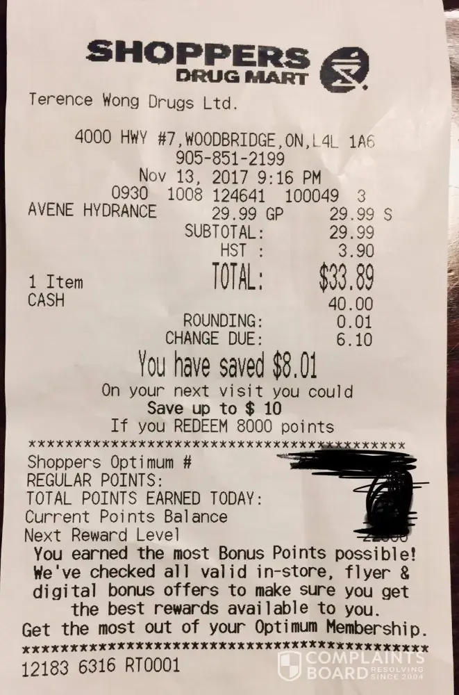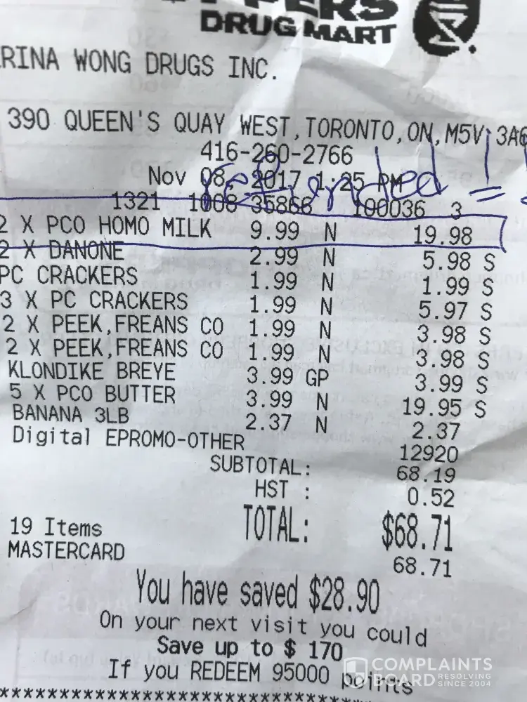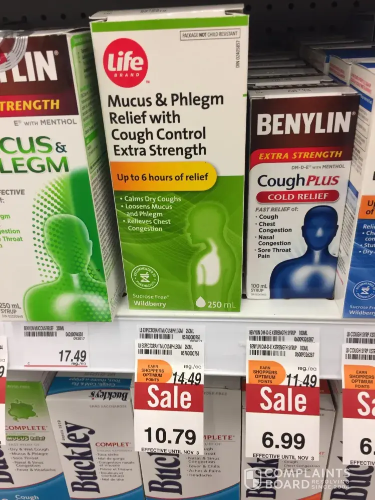 Nov 1, 2017 I went to Shoppers Drug Mart to purchase cough syrup. I saw $10.49 LIFE BEAND (LB) incl gst $11.01 on sale. I bought it. Went home, checked my recept, they charged me $15.21 incl gst. Next day, I went back there to take picture. It was stock neatly and orderly on the same shelf with the same price tag $10.49 LB 250ML Exp Mucus P to deceive customers to buy it thinking it was on sale. When you go to pay, you will pay regular price $14.49 incl gst $15.21. The barcode number ending 51 on the price tag is one number different from the box barcode 50. Today i went there, ask for my money back. The supervisor, Rosalie, told me that the cough syrup box barcode is not the same with the price tag barcode. I told them that the item should have the correct price tag where it should belong. They blamed the customers for putting that cough syrup on the wrong section. Common sense is that customers will not arrange the same items neatly and orderly in the same row on the same price tag. She does not even admit that they did wrong. She wants me to think that i picked the item which the customer left on the shelf where the wrong price tag was.