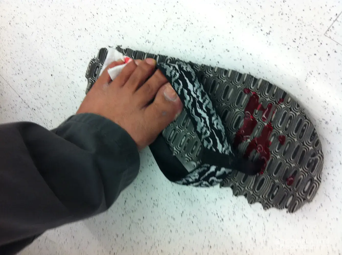 Not sure if you've managed to connect these dots yet, but your husband's foot is just as bloody as it would have been if you'd driven across town wearing those bunny slippers rather than walking a couple of blocks in them.